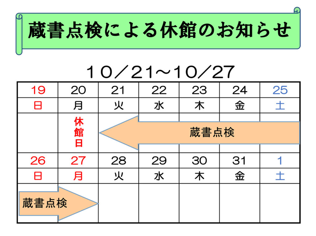 10月21日(火)~10月27日(月) 蔵書点検による休館のお知らせ 2025年9月27日 お知らせ いつも阿南町立図書館をご利用いただきましてありがとうございます。 蔵書点検のため、10月21日(火)~ 10月27日(月)まで休館とさせていただきます。この間、図書館への入館・貸出ができません。返却につきましては、返却ボックスへお返しいただけるようお願いいたします。 ご不便をおかけいたしますが、ご理解・ご協力をお願いいたします。